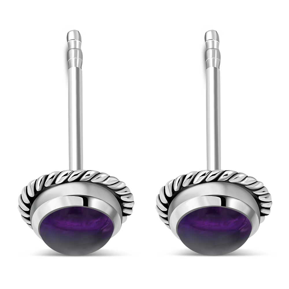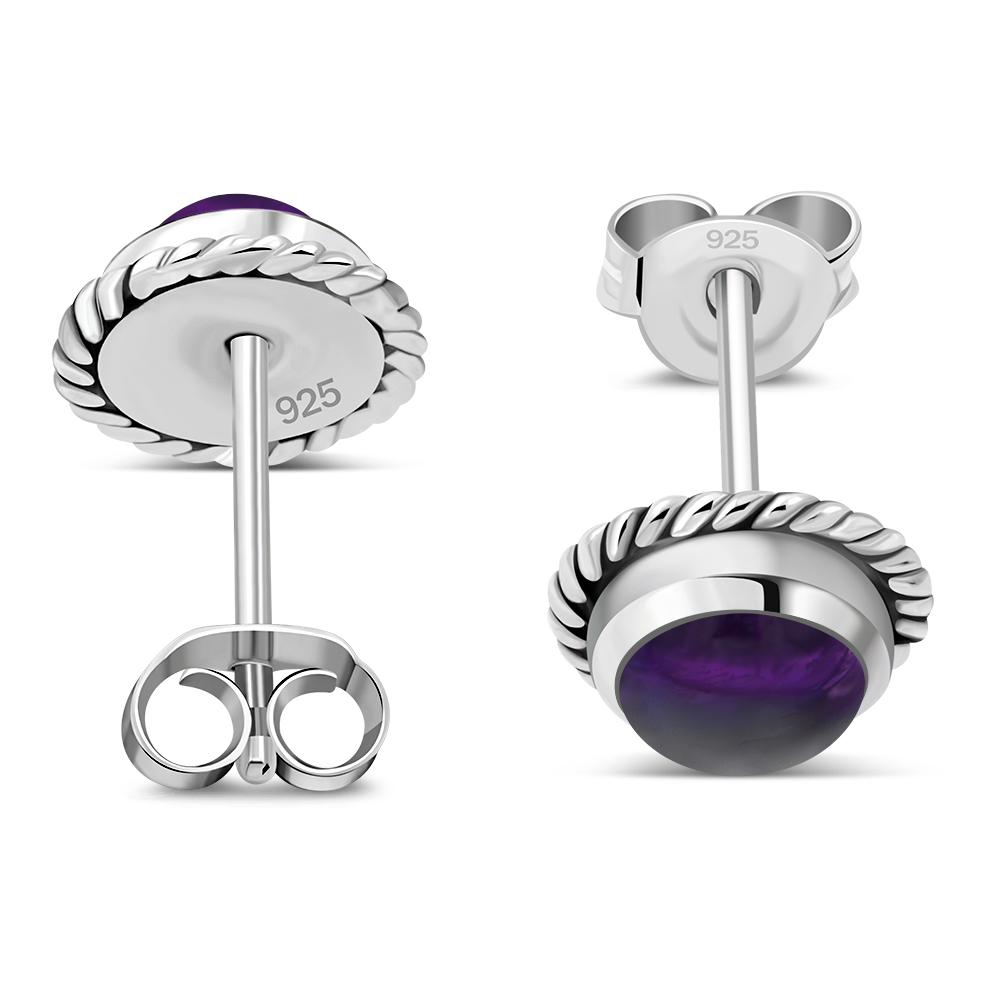 Theme: Round Amethyst Stone Stud Silver Earrings.