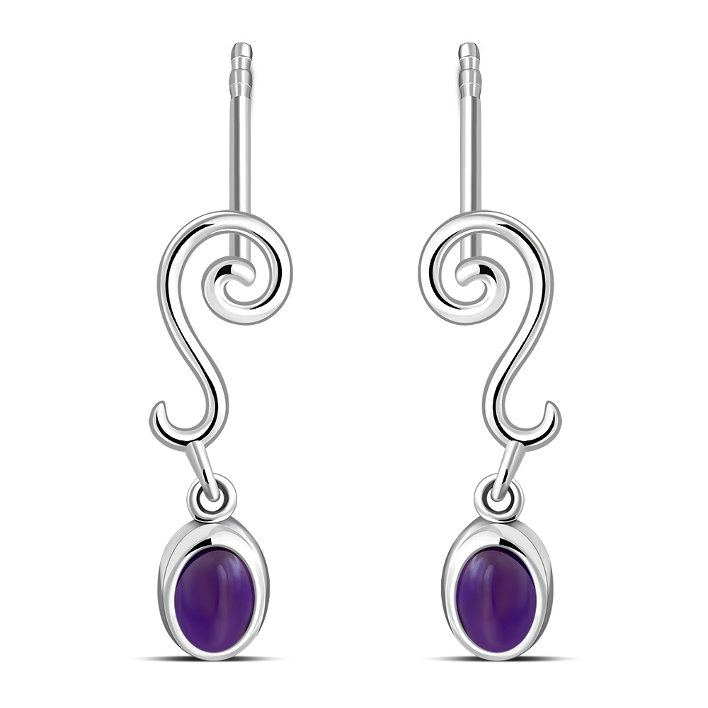 Swirling Ethnic Dangling Drop Stud Silver Earrings w/ Amethyst Stone