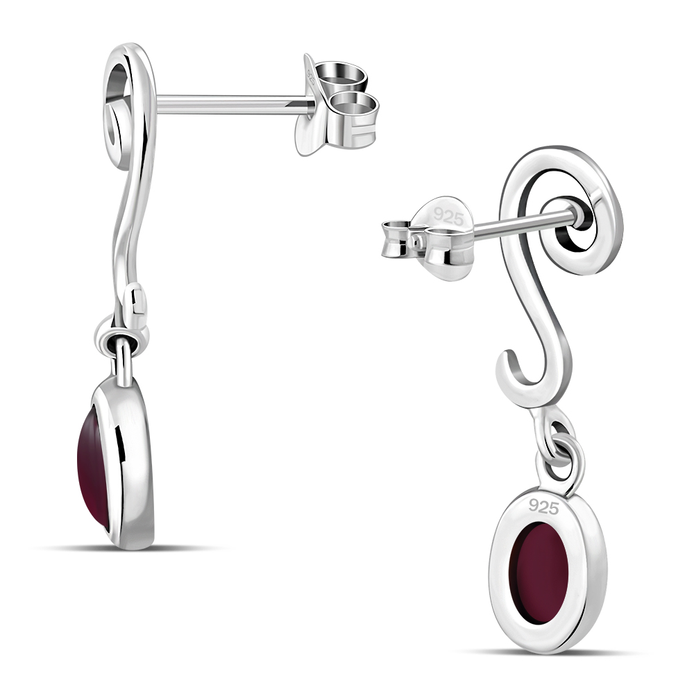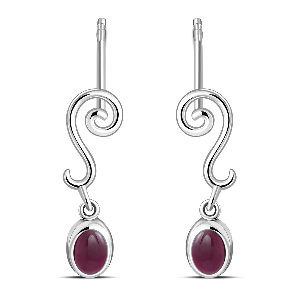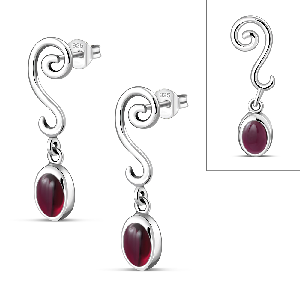 Swirling Ethnic Dangling Drop Stud Silver Earrings w/ Garnet Stone