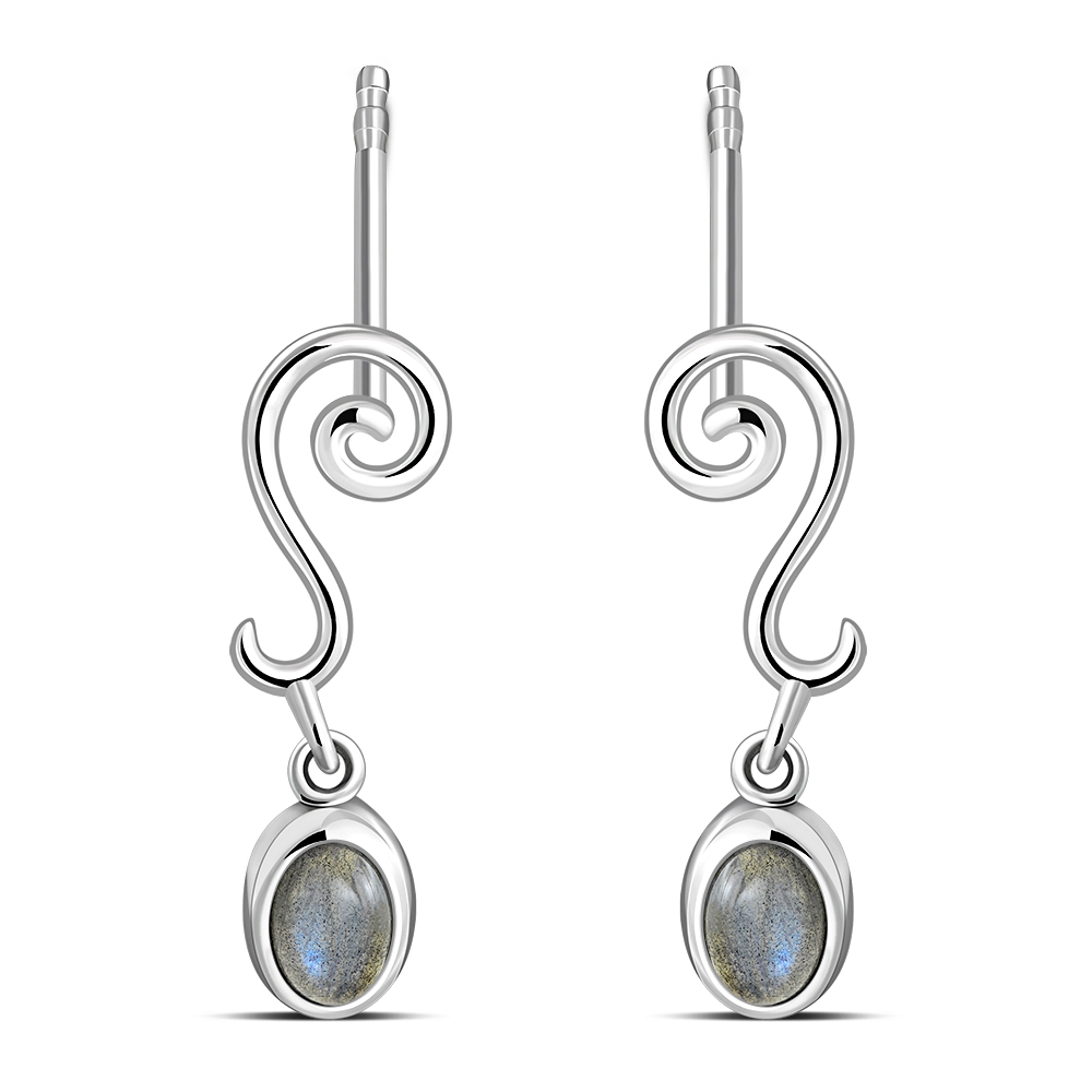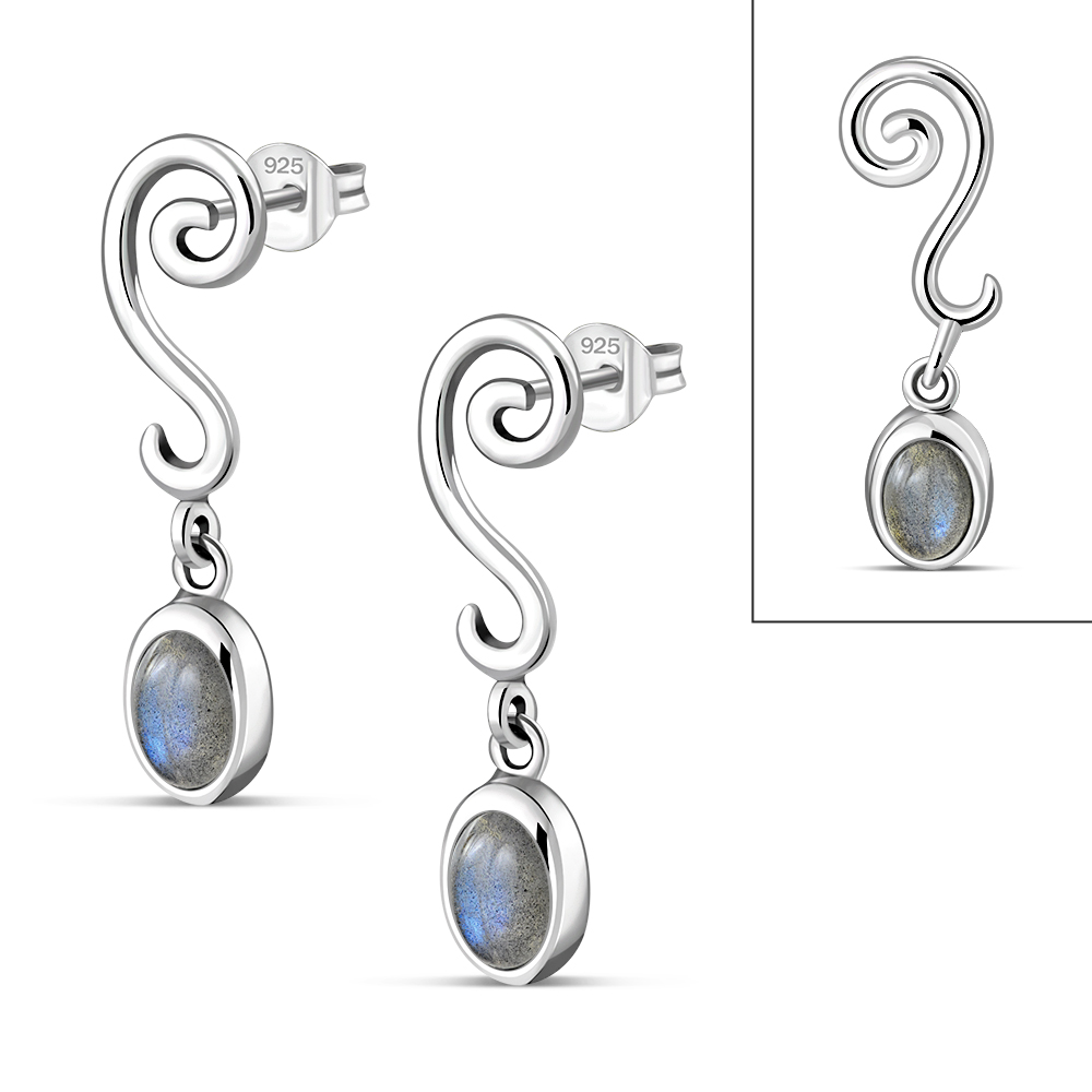 Swirling Ethnic Dangling Drop Stud Silver Earrings w/ Labradorite Stone