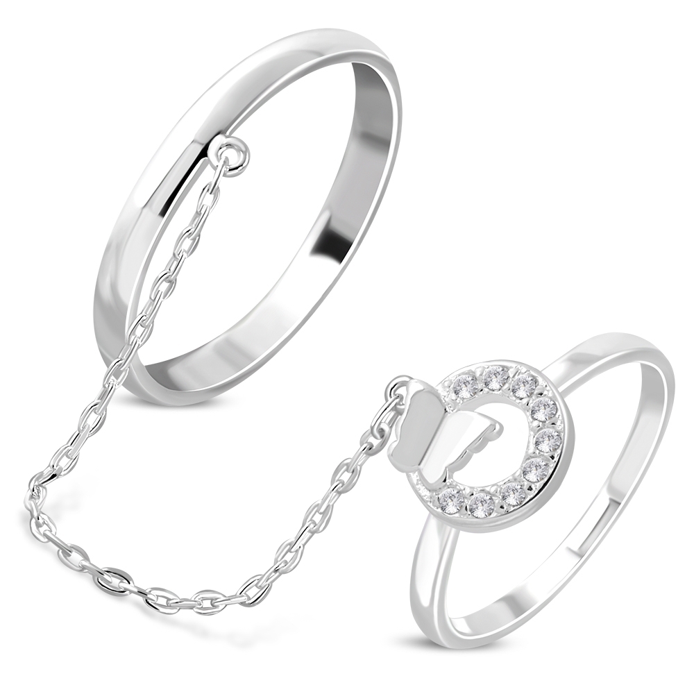 (0.8cm Wide) Brass w/ Silver Plating Micro Pave Butterfly Circle Two Finger Chain Linking Dangle Double Rings w/ Clear CZ - YDR043