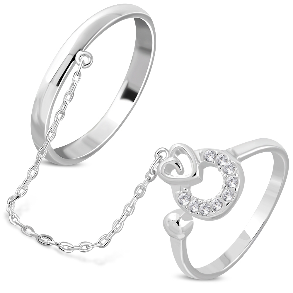 Description (0.8cm Wide) Brass w/ Silver Plating Micro Pave Heart Circle Two Finger Chain Linking Dangle Double Rings w/ Clear CZ - YDR048