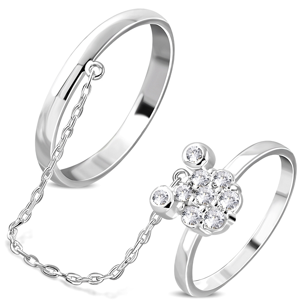 (0.8cm Wide) Brass w/ Silver Plating Micro Pave Little Mouse Two Finger Chain Linking Dangle Double Rings w/ Clear CZ - YDR007