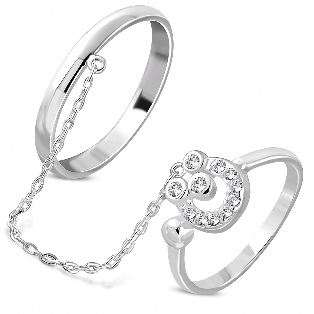 Description (0.9cm Wide) Brass w/ Silver Plating Micro Pave Little Mouse Two Finger Chain Linking Dangle Double Rings w/ Clear CZ - YDR010