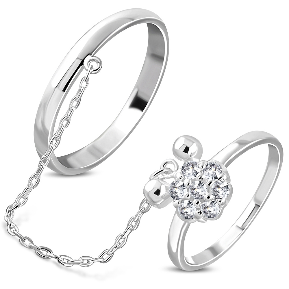 (0.8cm Wide) Brass w/ Silver Plating Micro Pave Little Mouse Two Finger Chain Linking Dangle Double Rings w/ Clear CZ - YDR025
