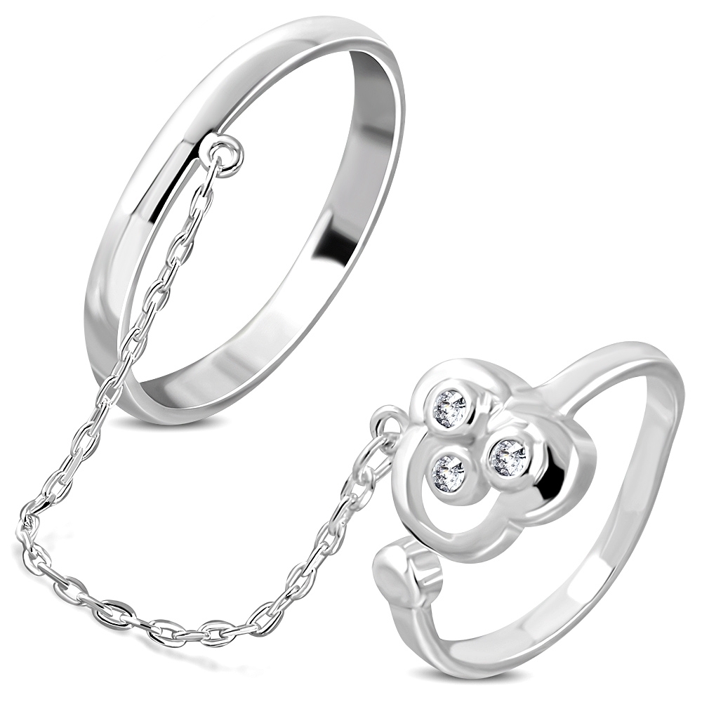 Description (0.8cm Wide) Brass w/ Silver Plating Micro Pave Little Mouse Two Finger Chain Linking Dangle Double Rings w/ Clear CZ - YDR028