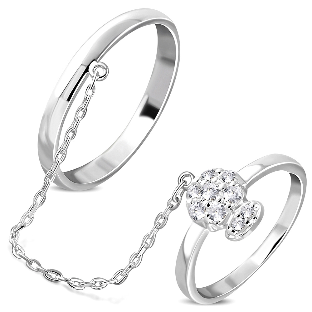 (0.8cm Wide) Brass w/ Silver Plating Micro Pave Skull Two Finger Chain Linking Dangle Double Rings w/ Clear CZ - YDR008