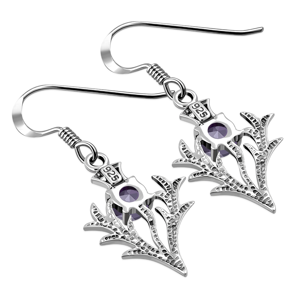 as: Faceted Amethyst Stone Silver Scottish Thistle Earrings, Sterling
