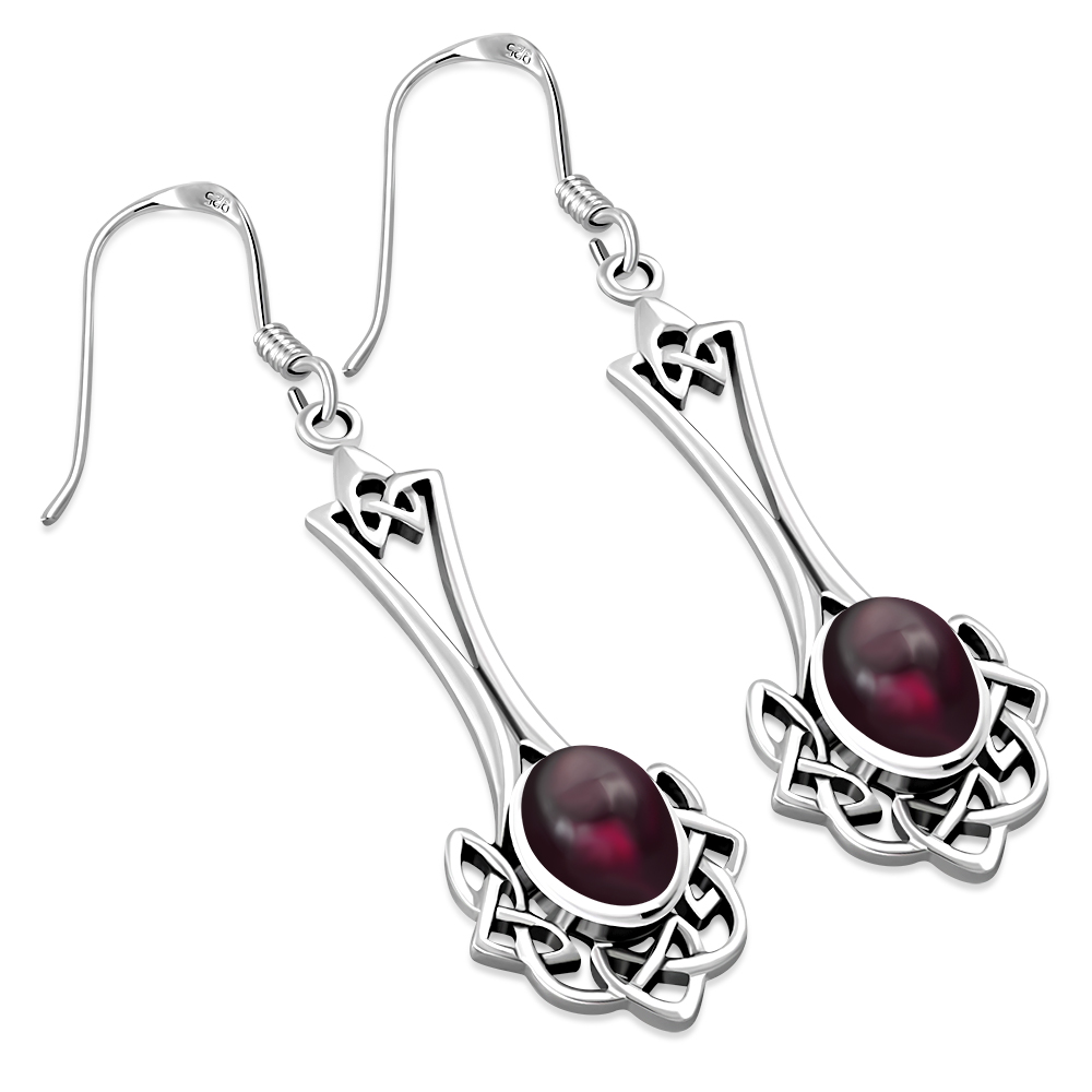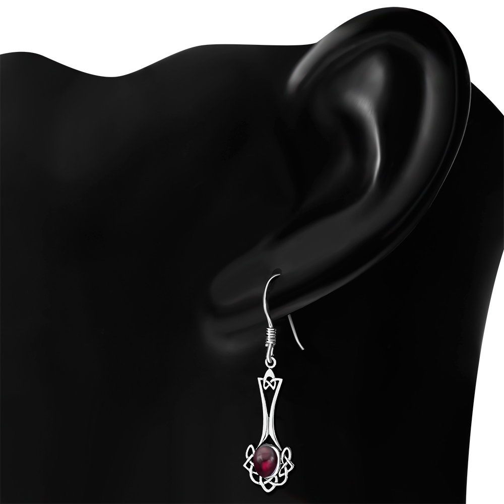 Long Celtic Knot Silver Earrings set w Garnet.