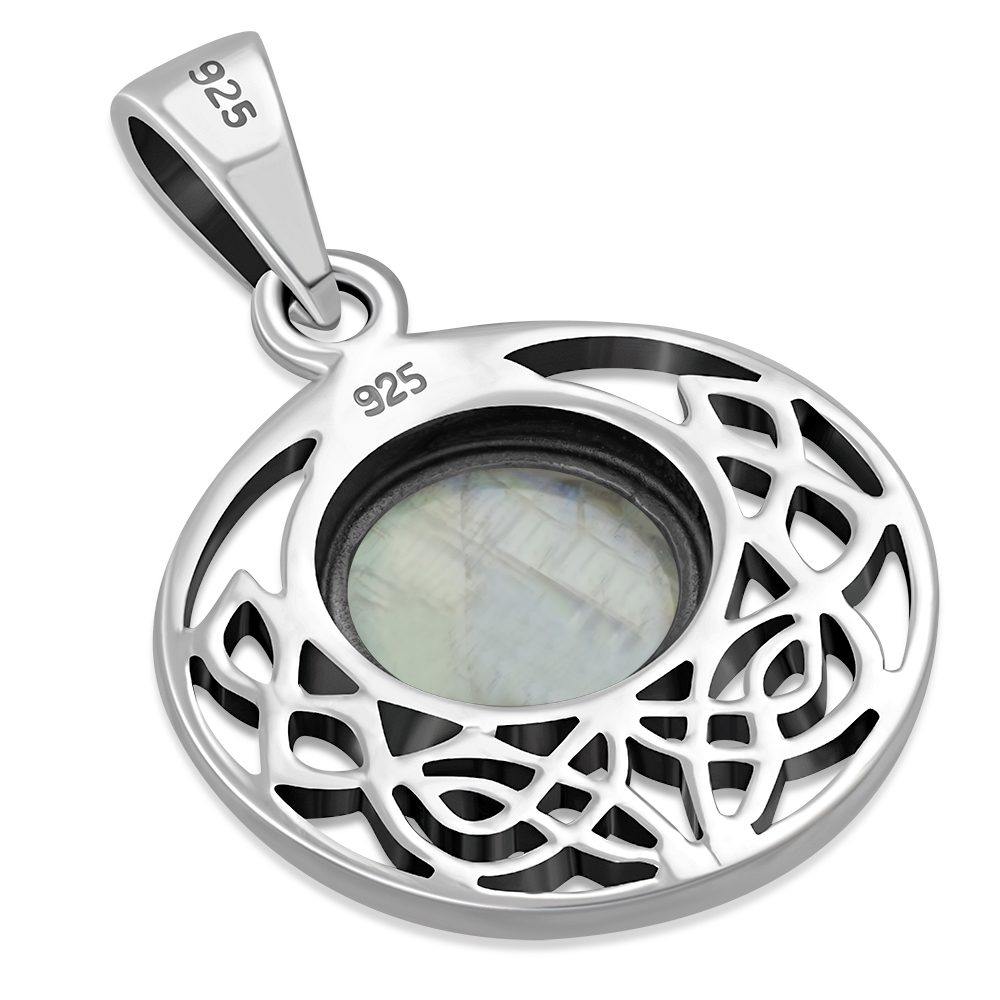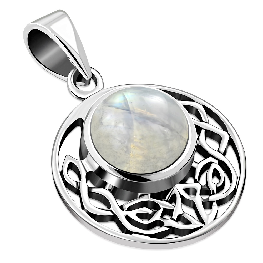 Rainbow Moonstone Round Celtic Knot Silver Pendant