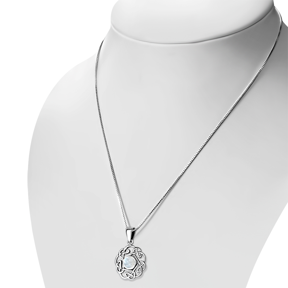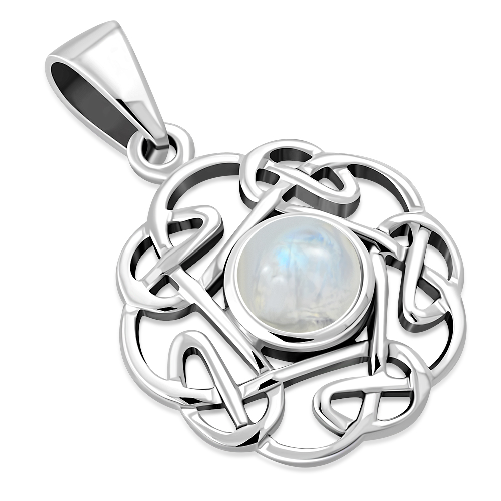 Theme: Small Rainbow Moonstone Round Celtic Knot Silver Pendant.