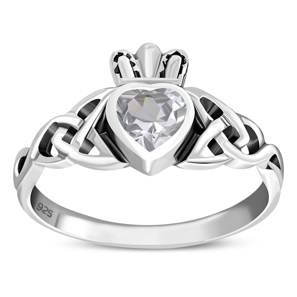 Trinity Knot Clear CZ Claddagh Silver Ring