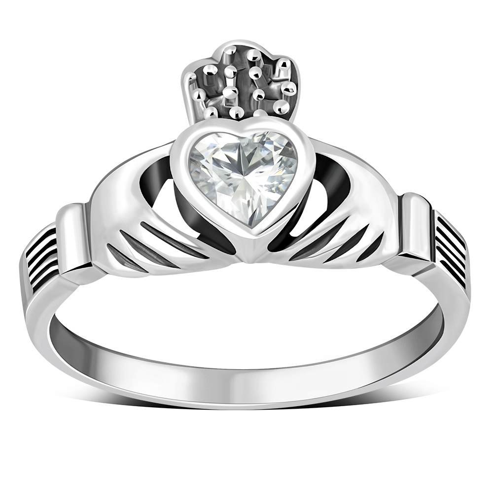 Irish Claddagh Sterling Silver Ring set w/ Clear CZ, r446
