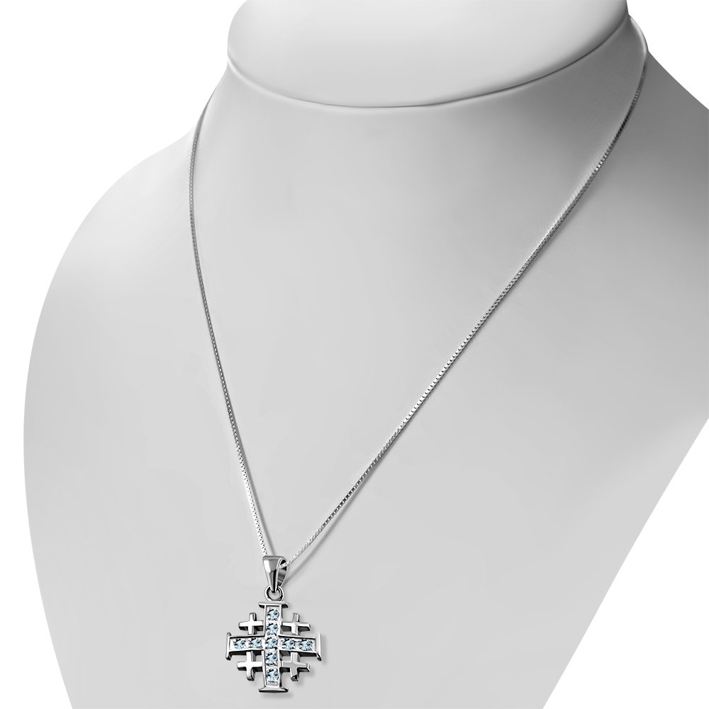 Jerusalem Cross Silver Pendant, Blue Topaz CZ Jerusalem Cross Silver