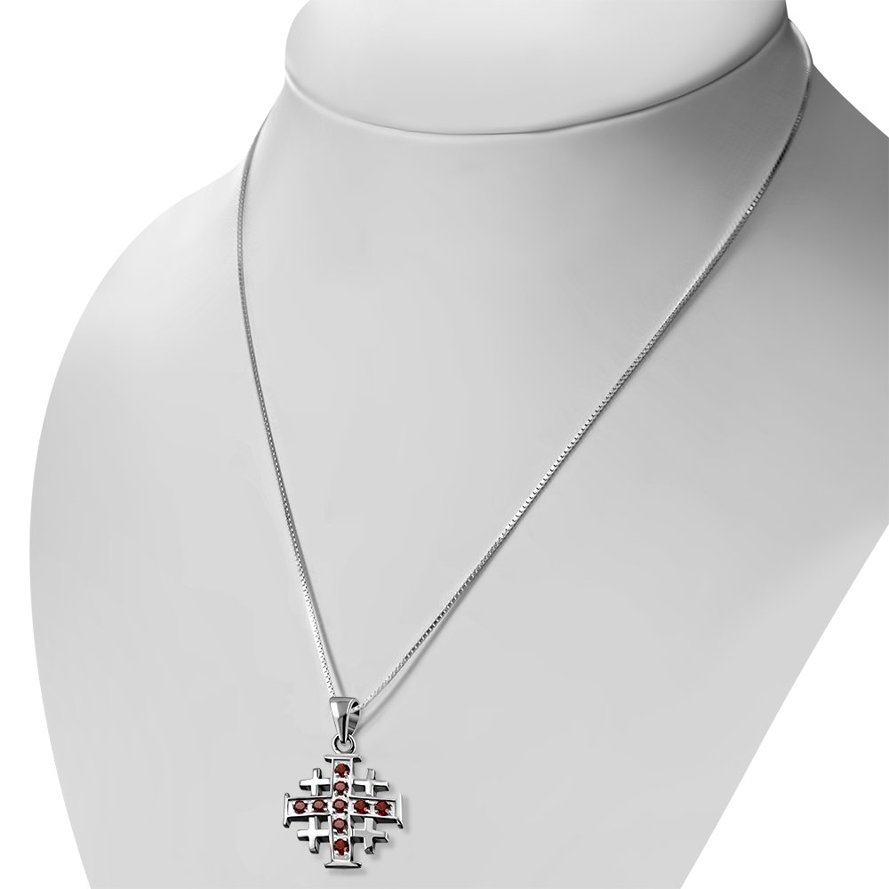 Theme: Garnet CZ Jerusalem Cross Silver Pendant.