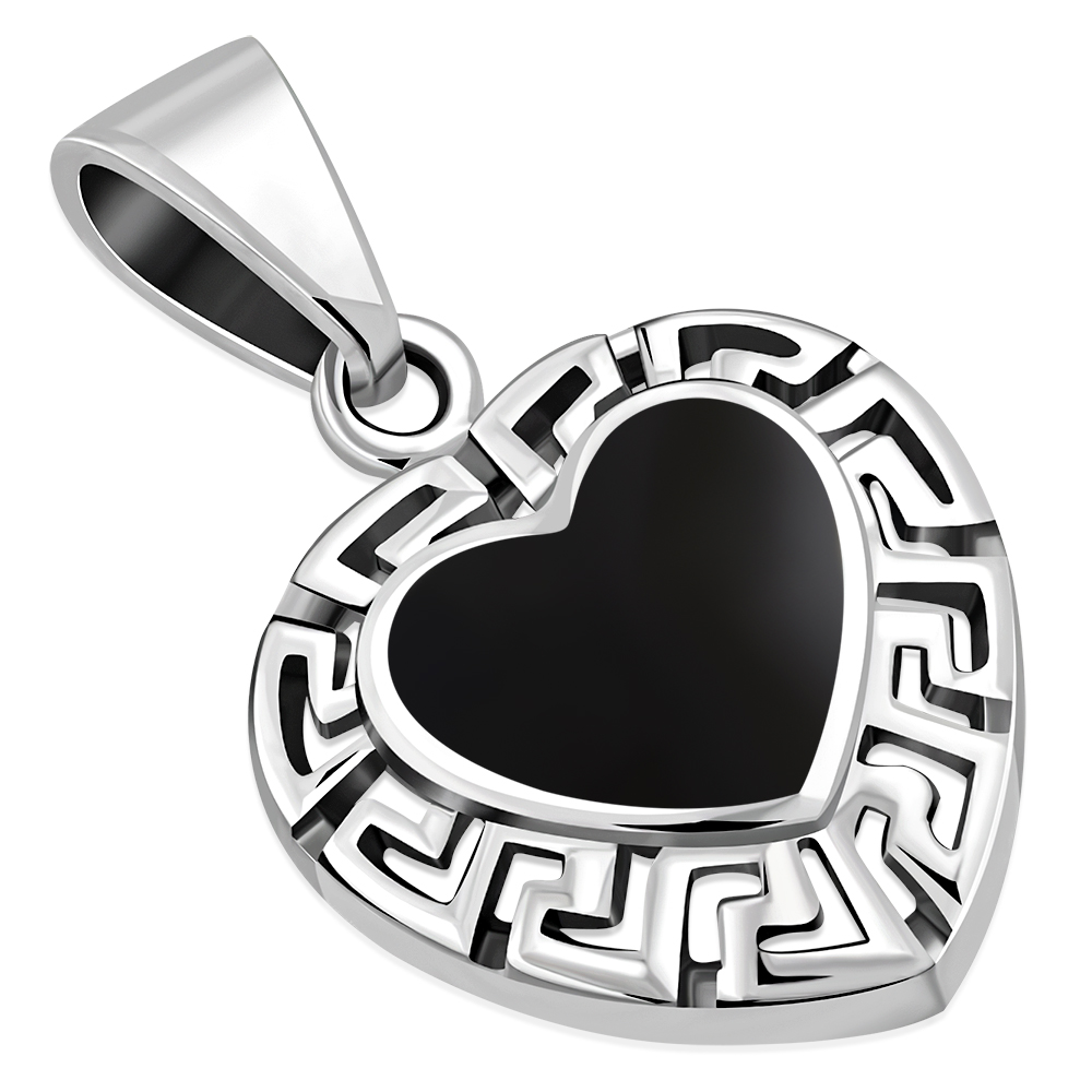 Theme: Black Onyx Heart Greek Key Silver Pendant.