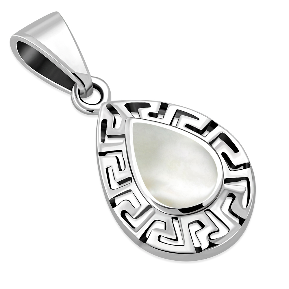 Theme: Mother of Pearl Drop Greek Key Silver Pendant.