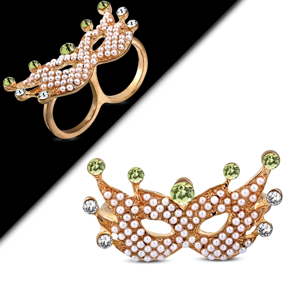 Fashion Rose/ Pink Gold Color Plated Fancy Masquerade Mask Two Finger Double Knuckle Ring w/ Peridot CZ & Bead - FRA235