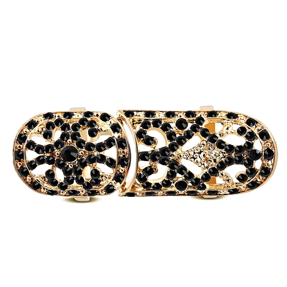 (6cm Wide) Fashion Rose/ Pink Gold Color Plated Filigree Flower Connector Full Finger Ring w/ Jet Black CZ - FRA250