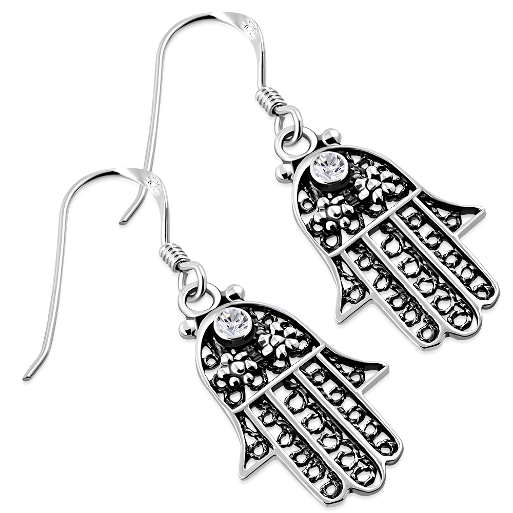 as: Silver Filigree Work Hamsa Earrings, Silver Filigree Work Hamsa