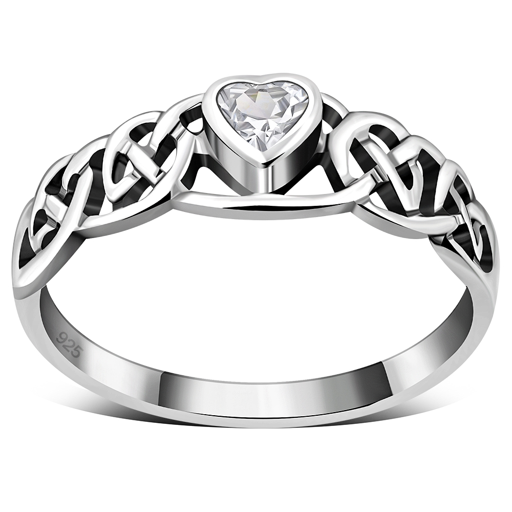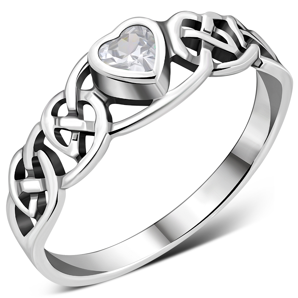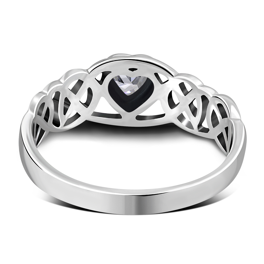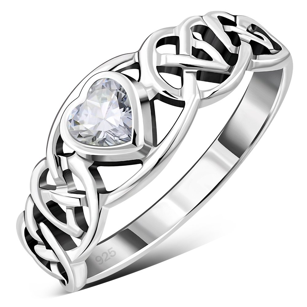 Theme: Celtic Knot Clear CZ Heart Silver Ring.